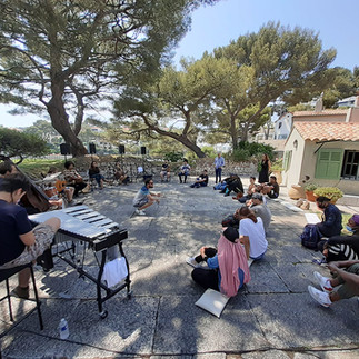 Temps de rencontre musicale à la fondation Camargo, lieu incroyable à Cassis (https://camargofoundation.org/fr/a-propos/visite-guidee/ ), à côté de la plage du Bessouan, avec 10 jeunes musiciens de la session interculturelle et leurs encadrants.